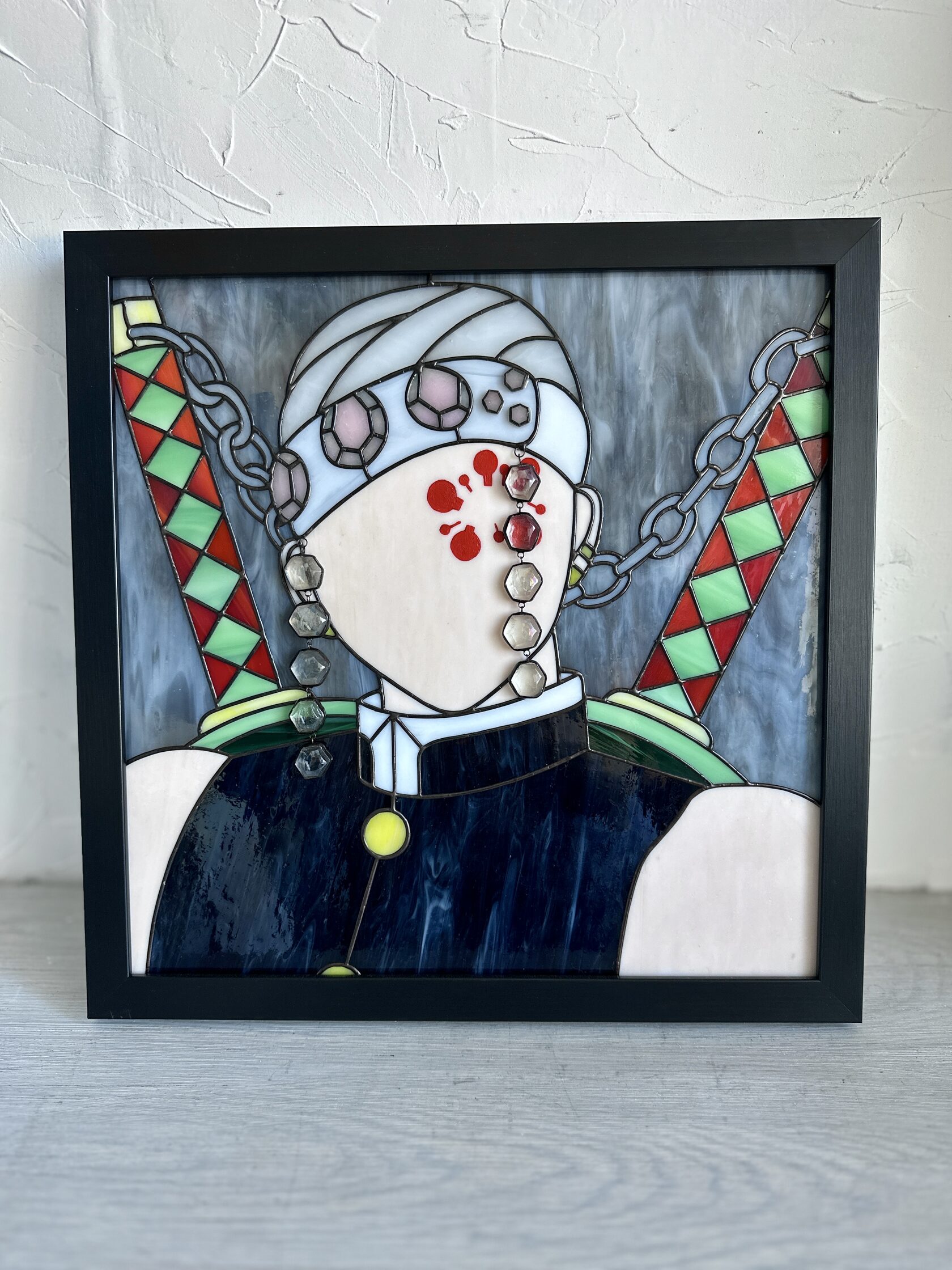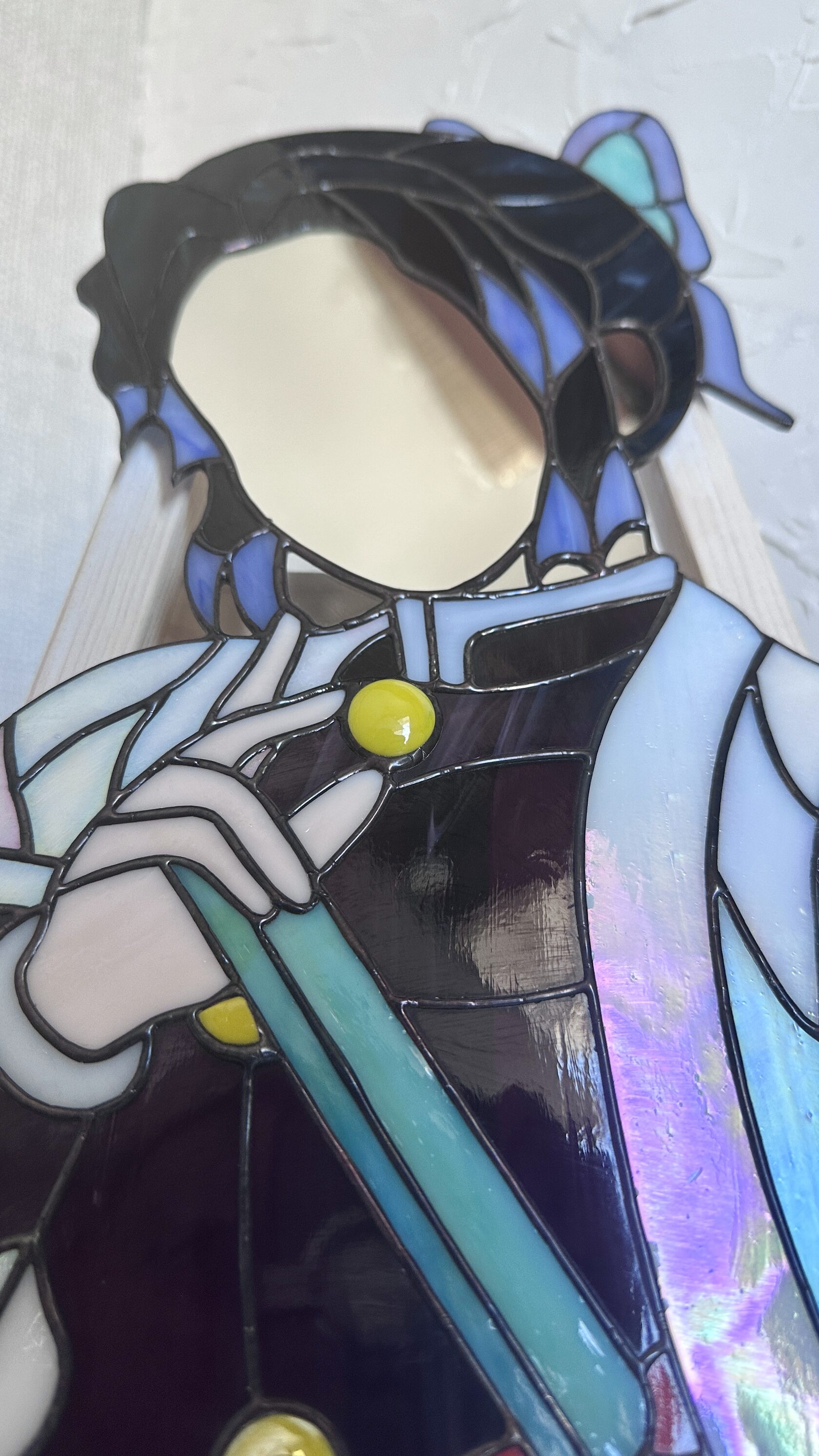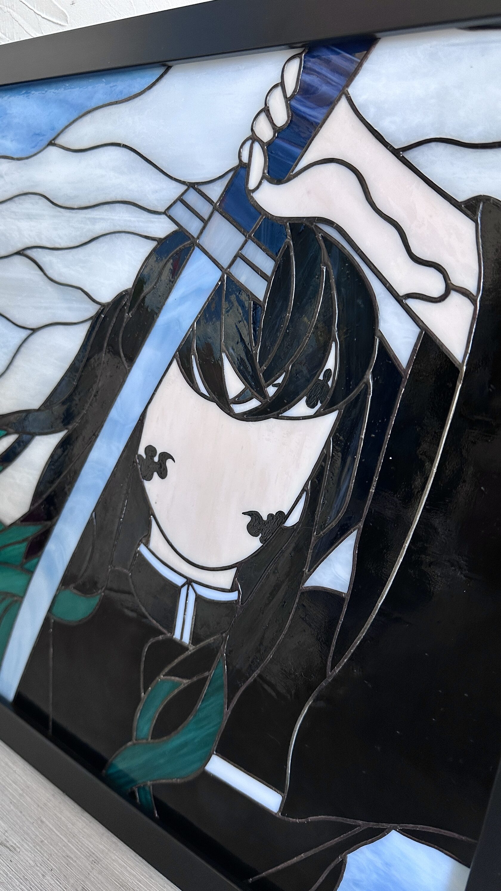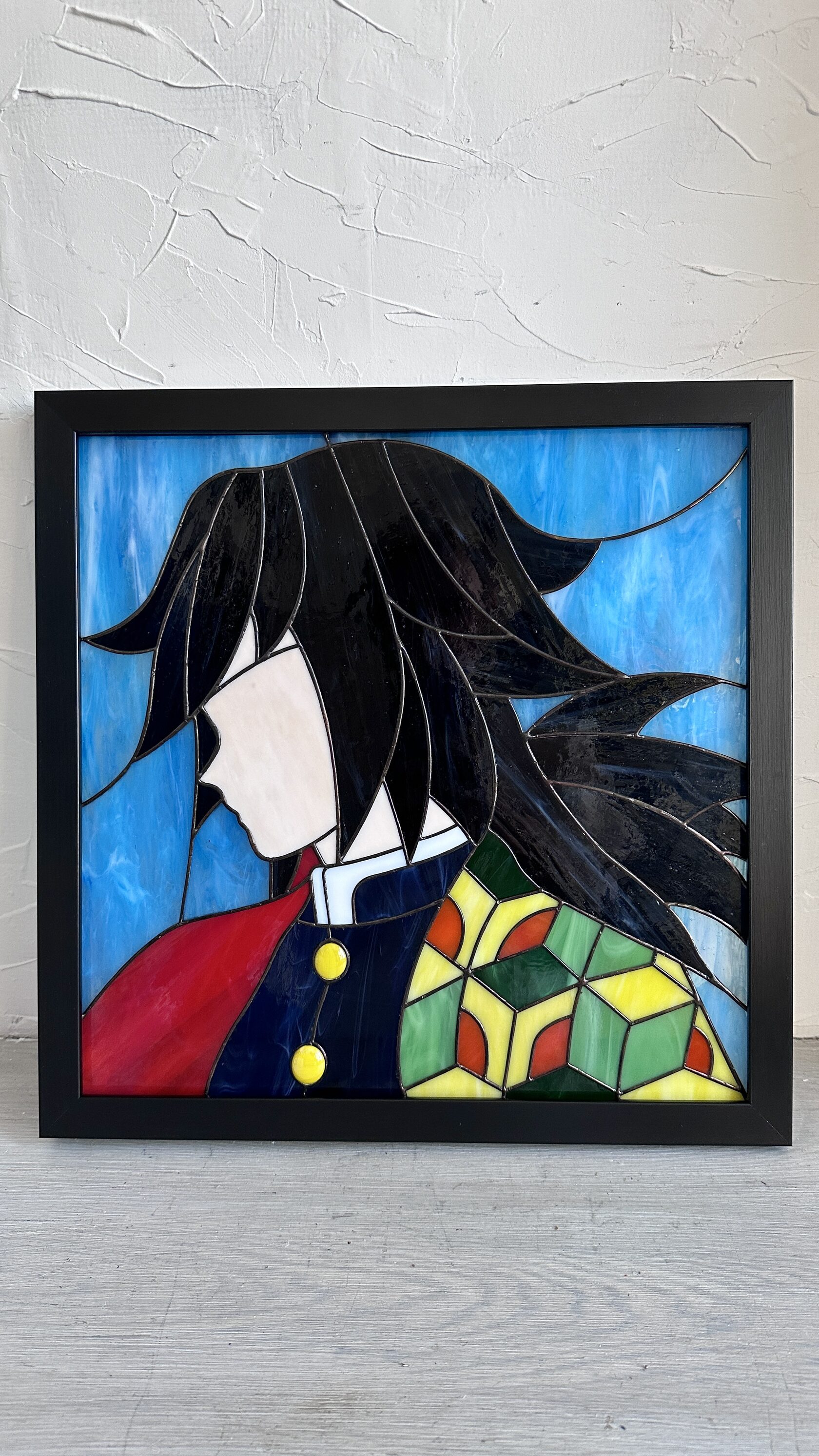 Витражное панно по мотивам аниме «Клинок рассекающий демонов». Выполнена подсветка. Работает от сети. Полностью ручная работа. В единственном экземпляре без повтора.