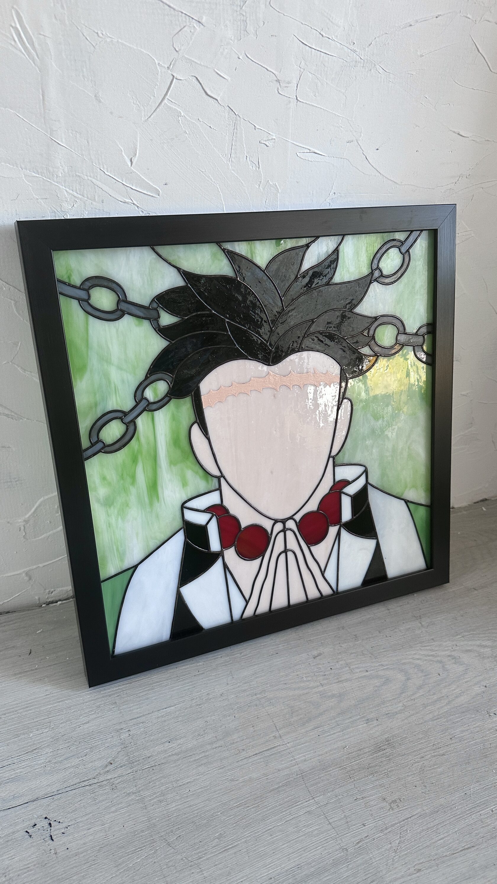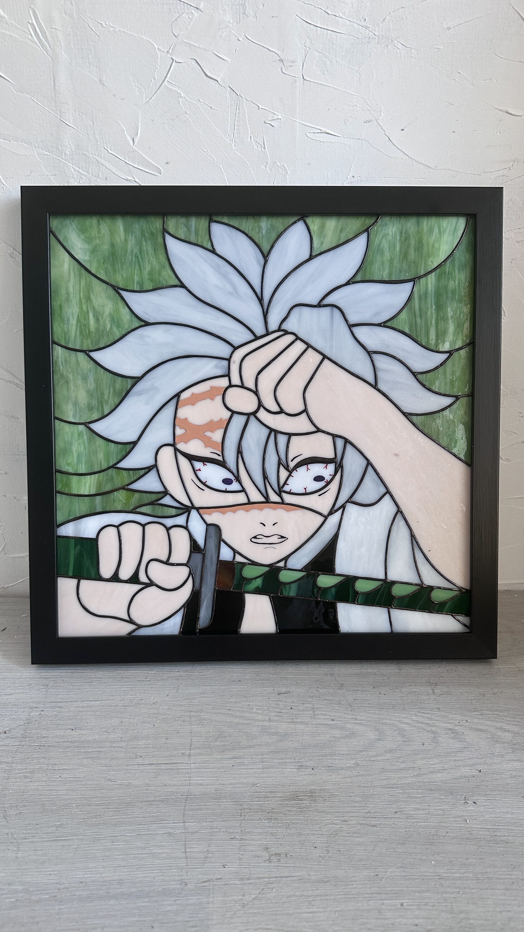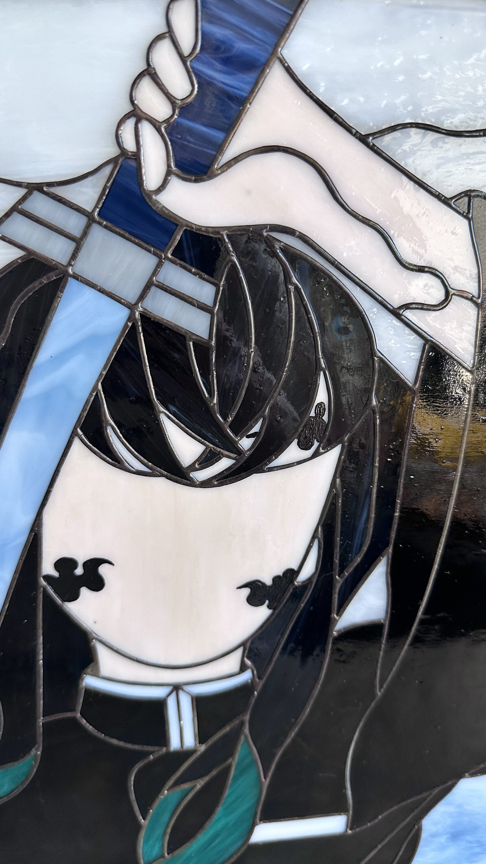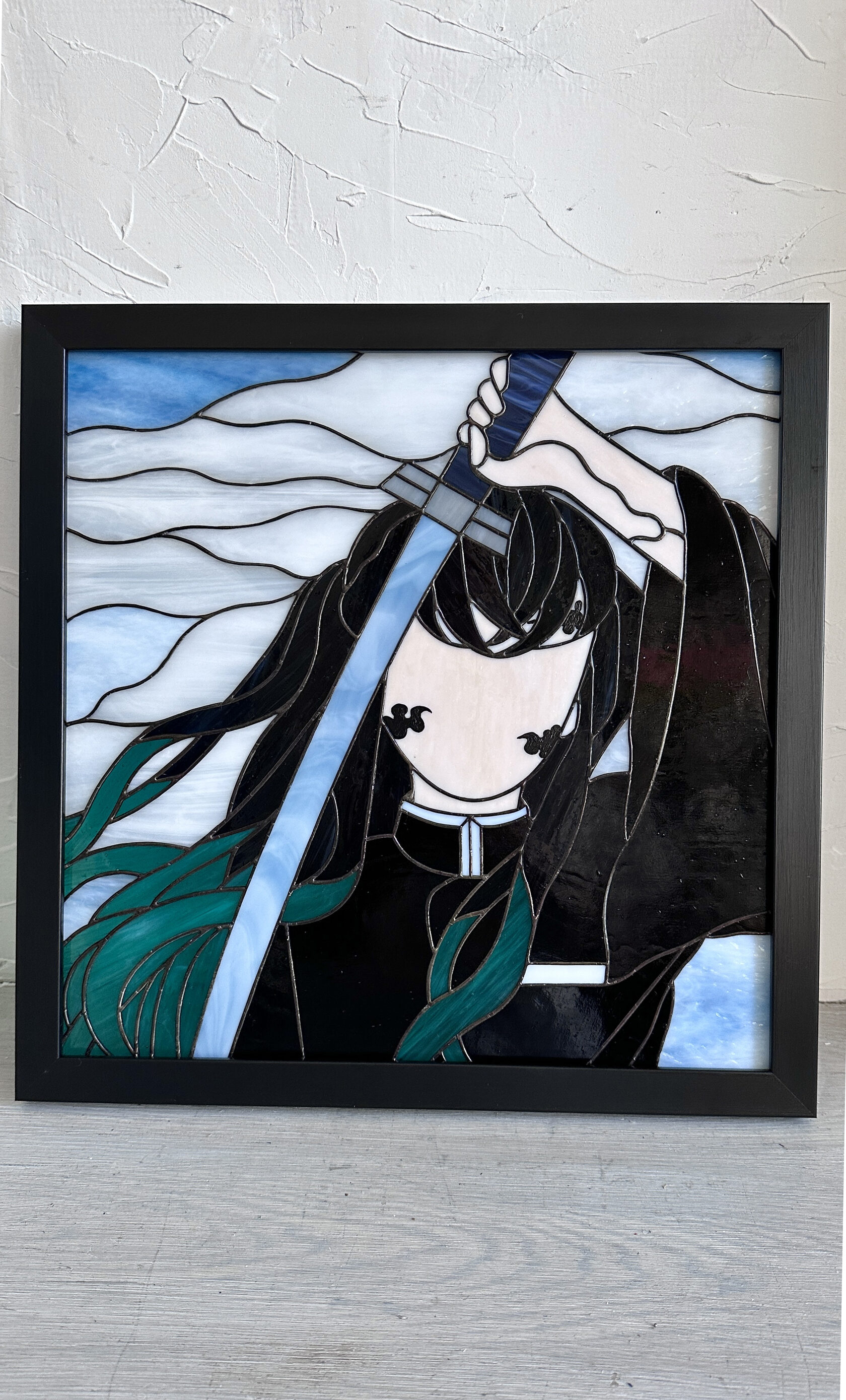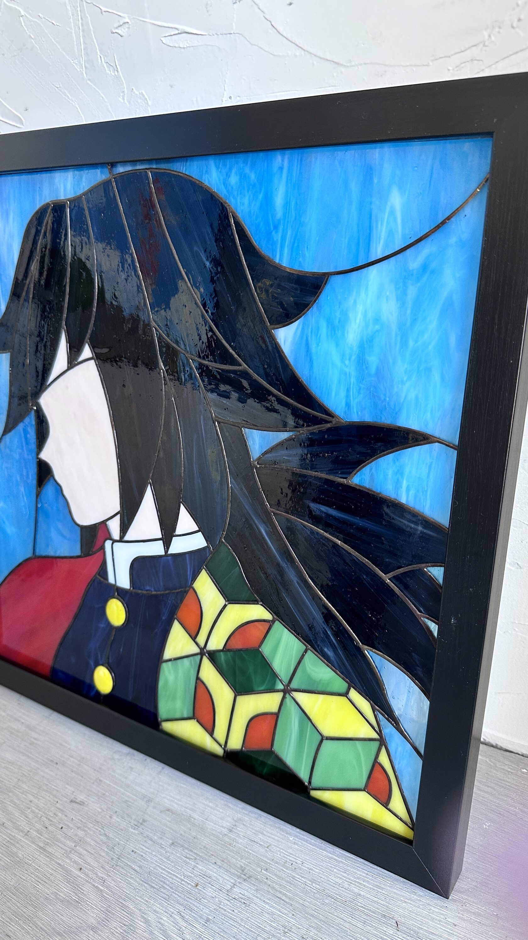 Витражное панно по мотивам аниме «Клинок рассекающий демонов». Выполнена подсветка. Работает от сети. Полностью ручная работа. В единственном экземпляре без повтора.
