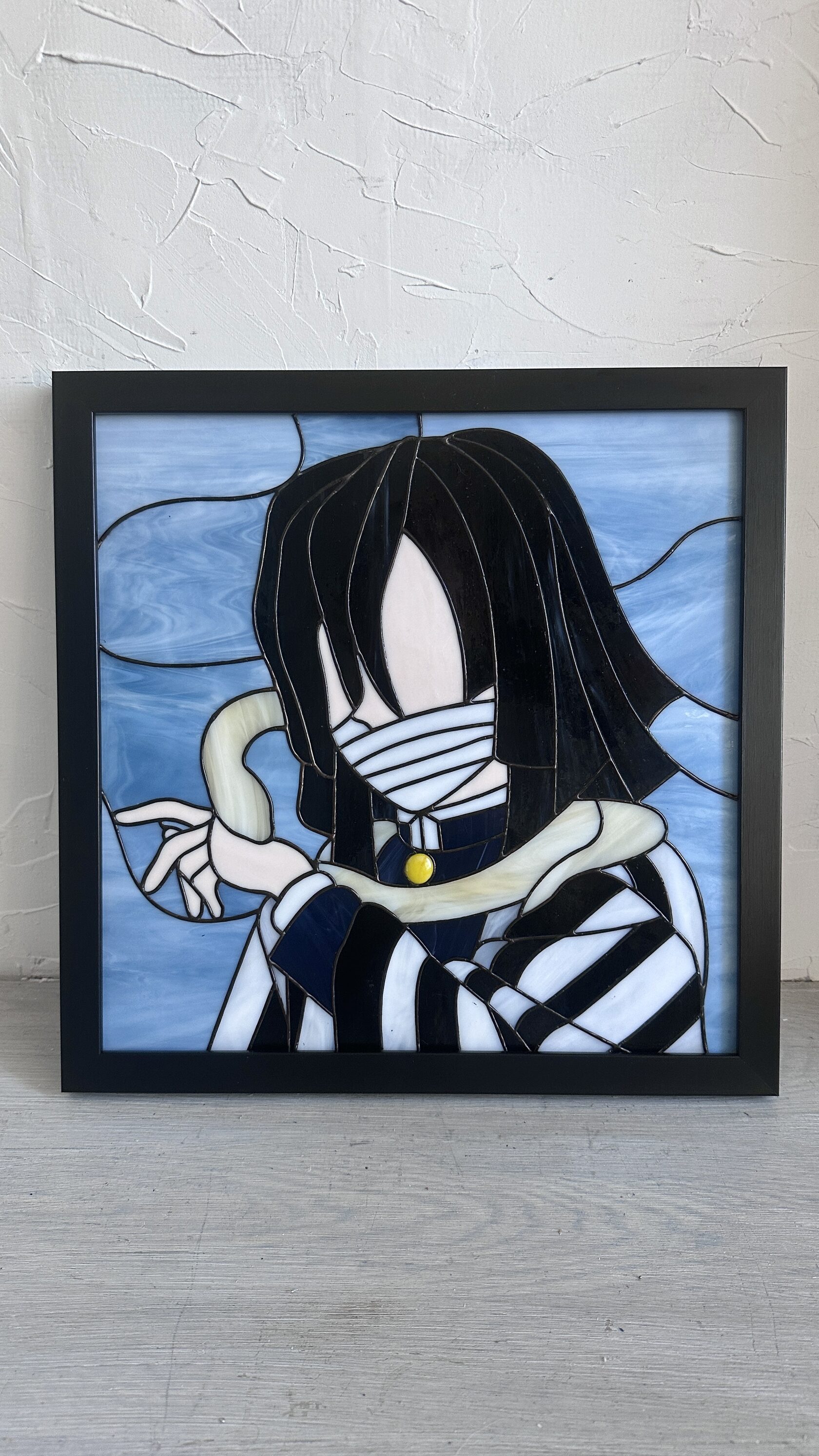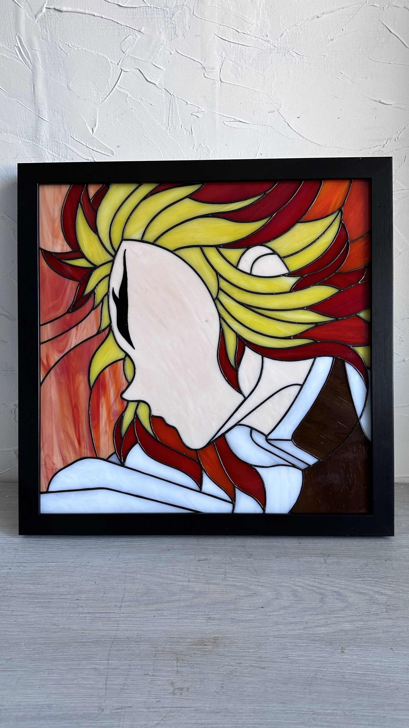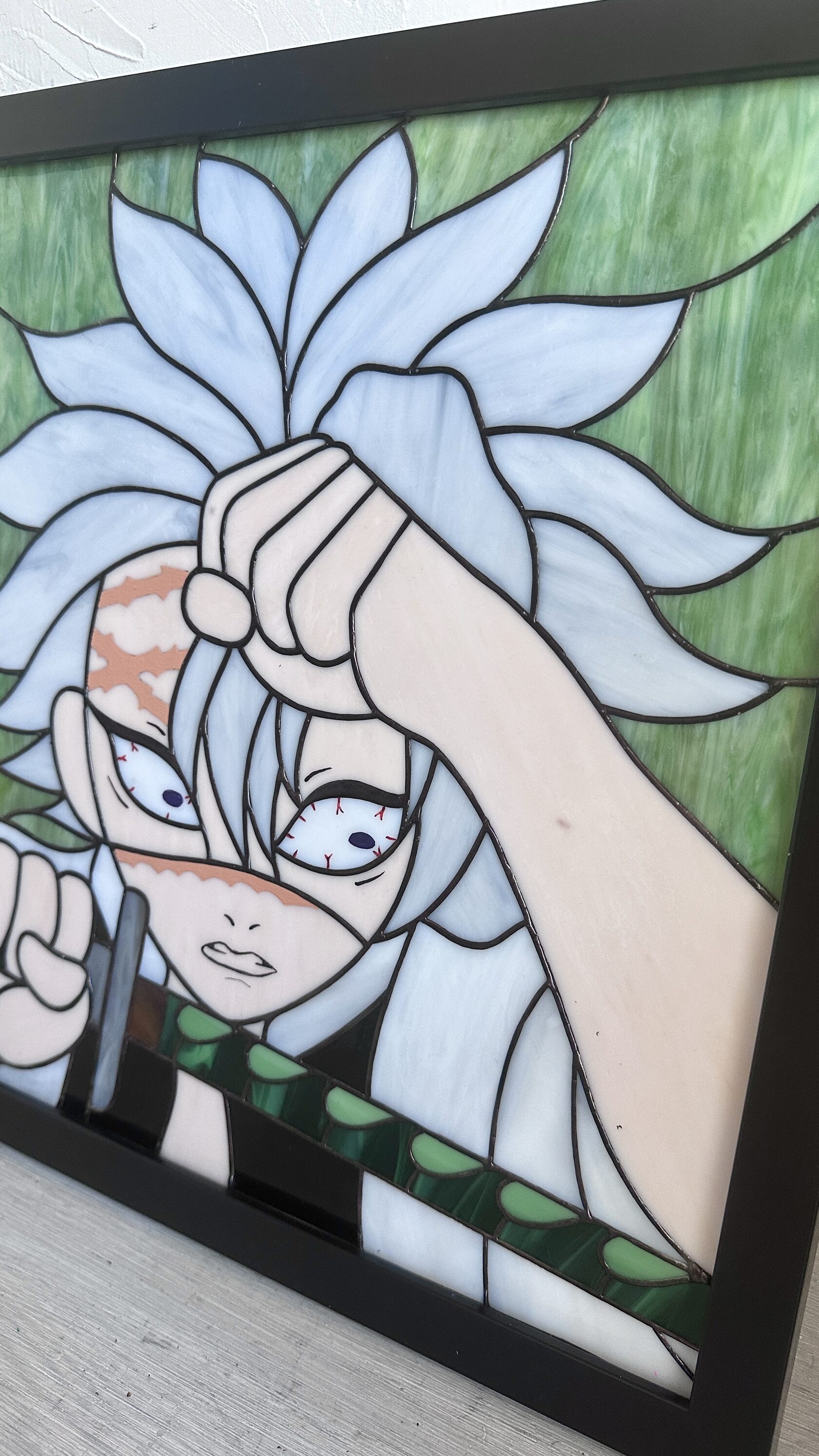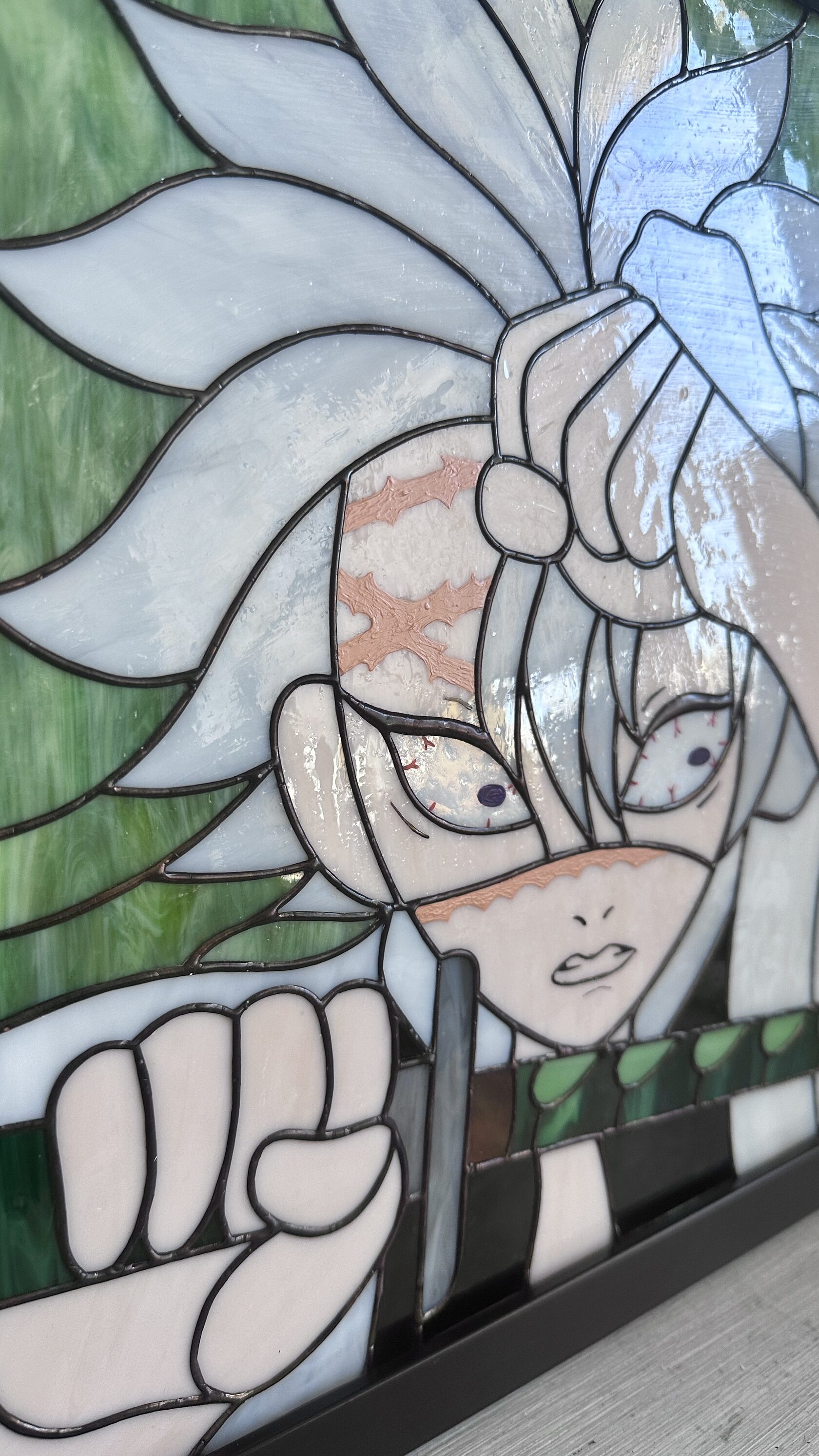 Витражное панно по мотивам аниме «Клинок рассекающий демонов». Выполнена подсветка. Работает от сети. Полностью ручная работа. В единственном экземпляре без повтора.