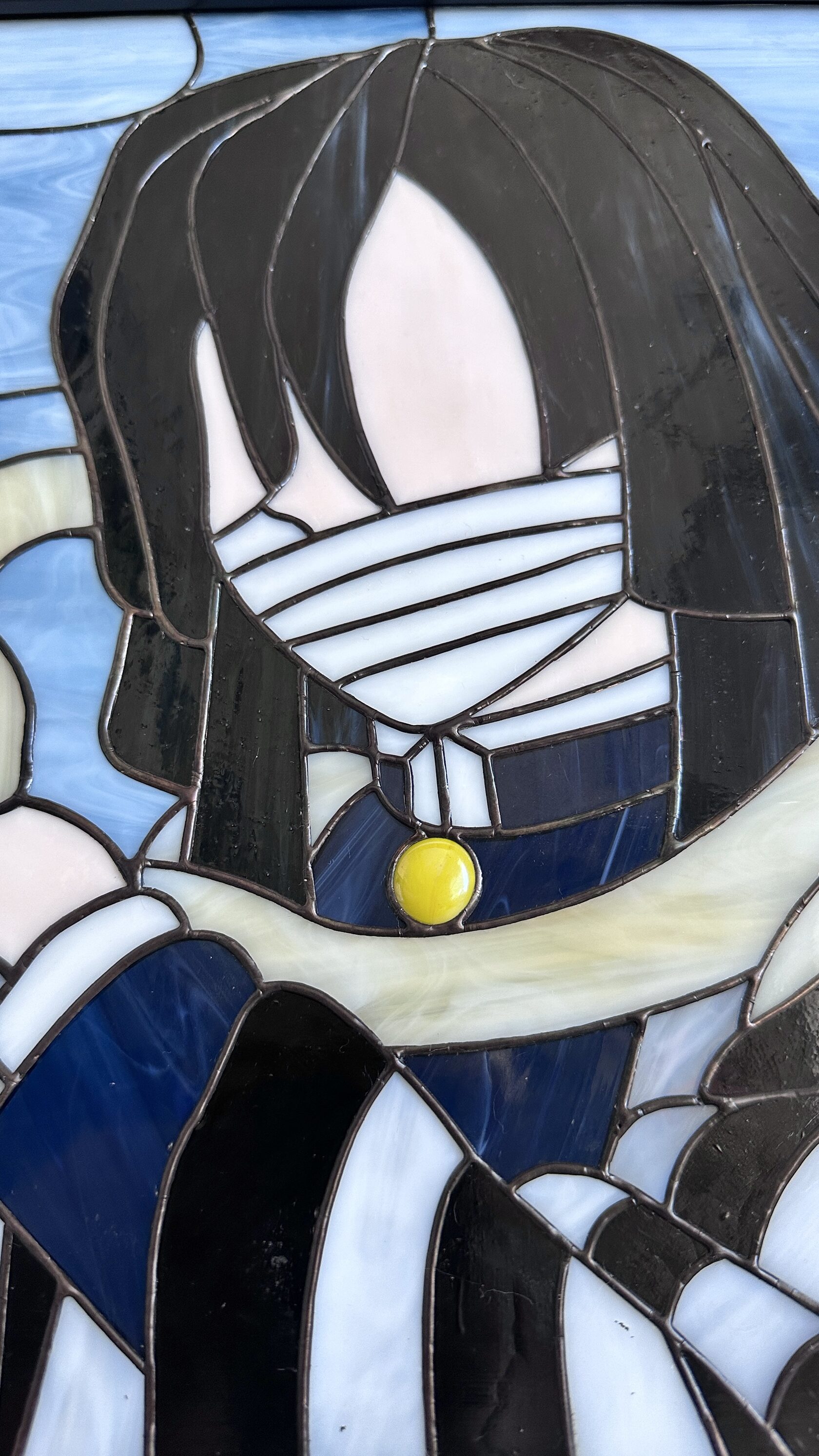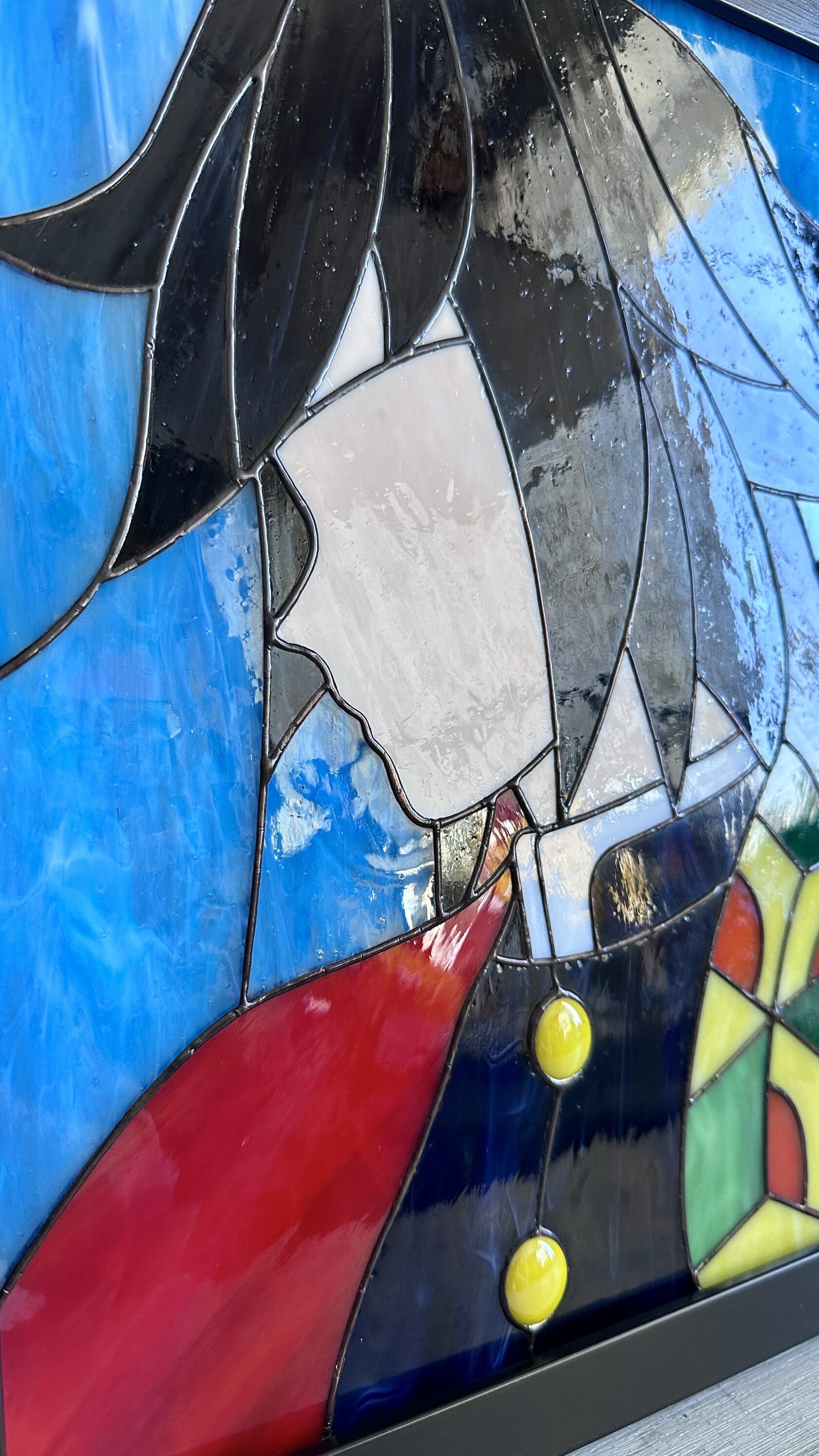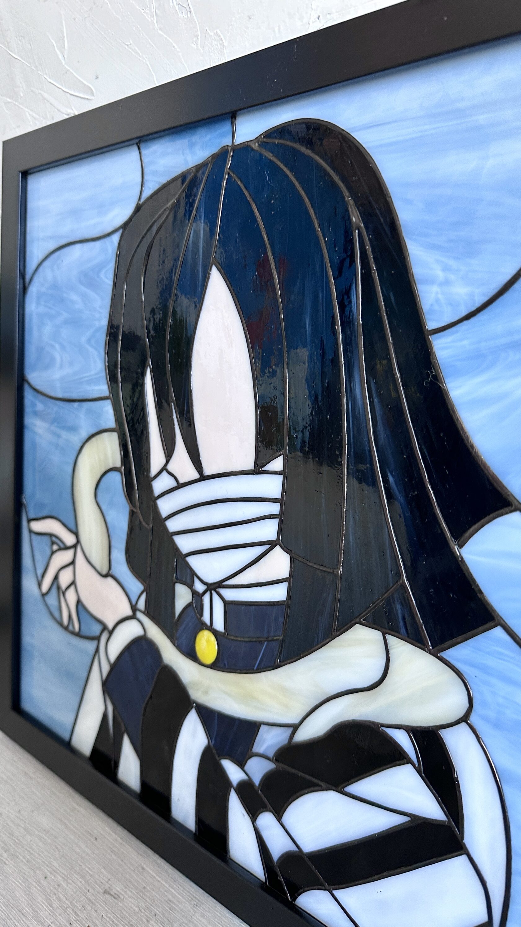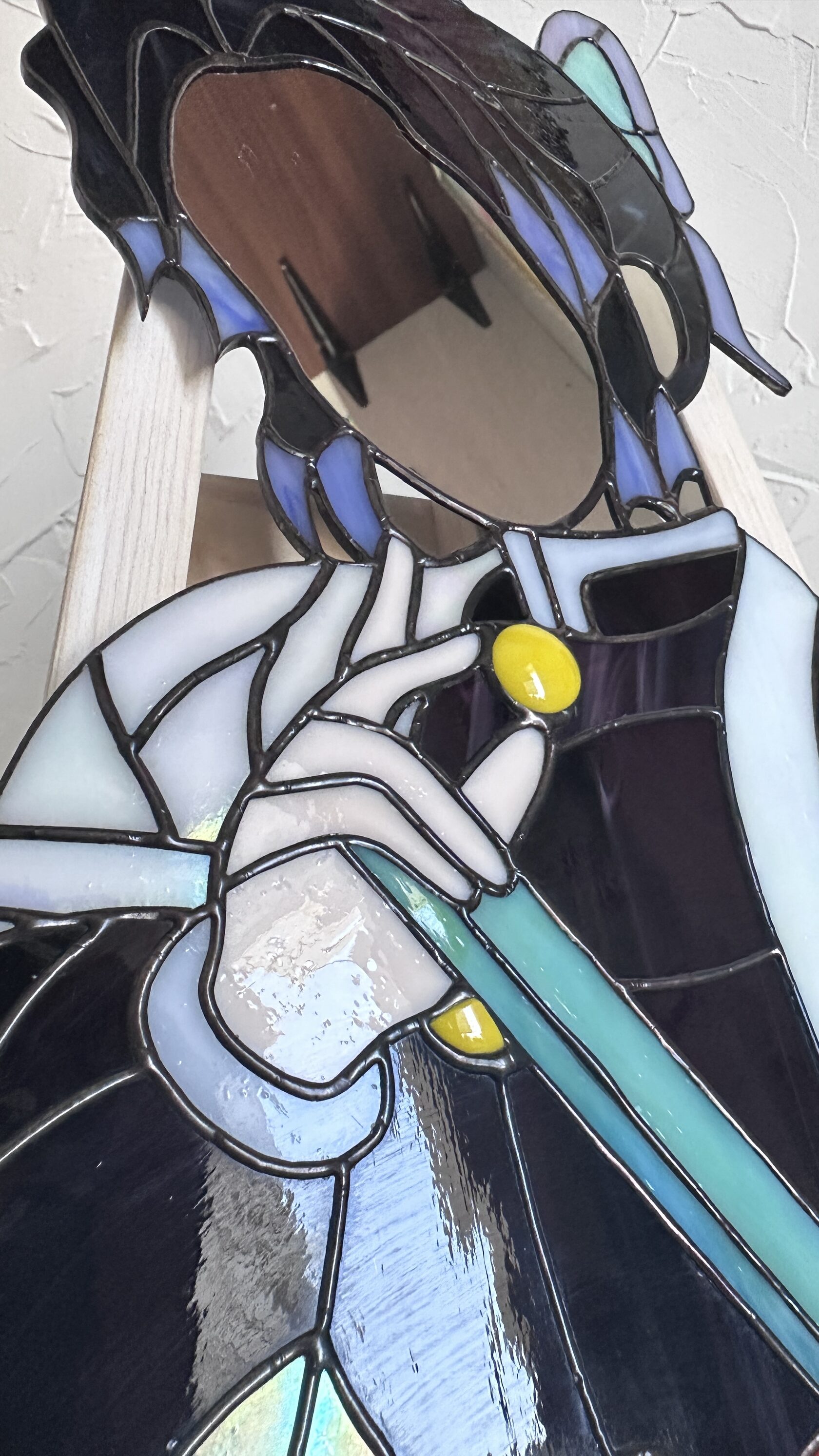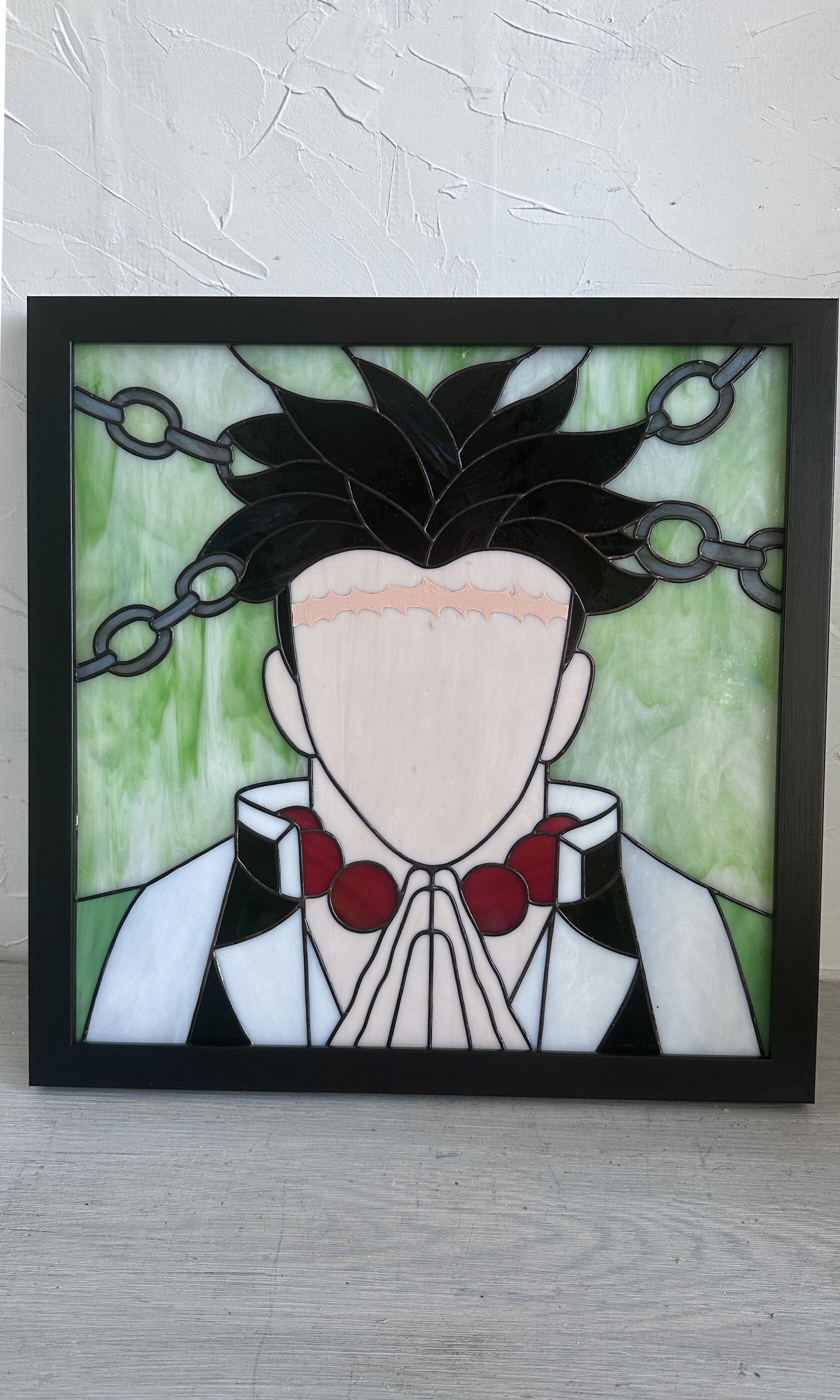 Витражное панно по мотивам аниме «Клинок рассекающий демонов». Выполнена подсветка. Работает от сети. Полностью ручная работа. В единственном экземпляре без повтора.