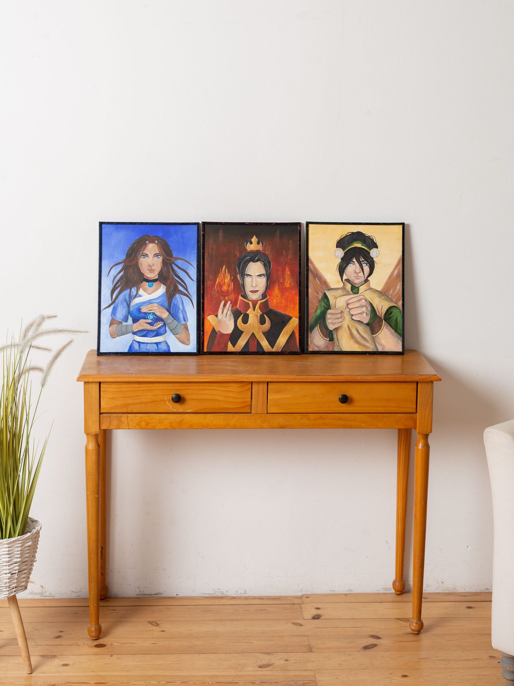 Триптих посвящен однму из моих любимы мульт-сериалов "Аватар. Легенда об Аанге". Я постаралась передать характер каждой героини: мягкая, добрая и заботливая Катара оберегает и греет взглядом, злая и хитрая Азула сейчас спалит все до тла, мощная и суровая Тоф кажется сейчас выпрыгнет с холста и врежет как следует.