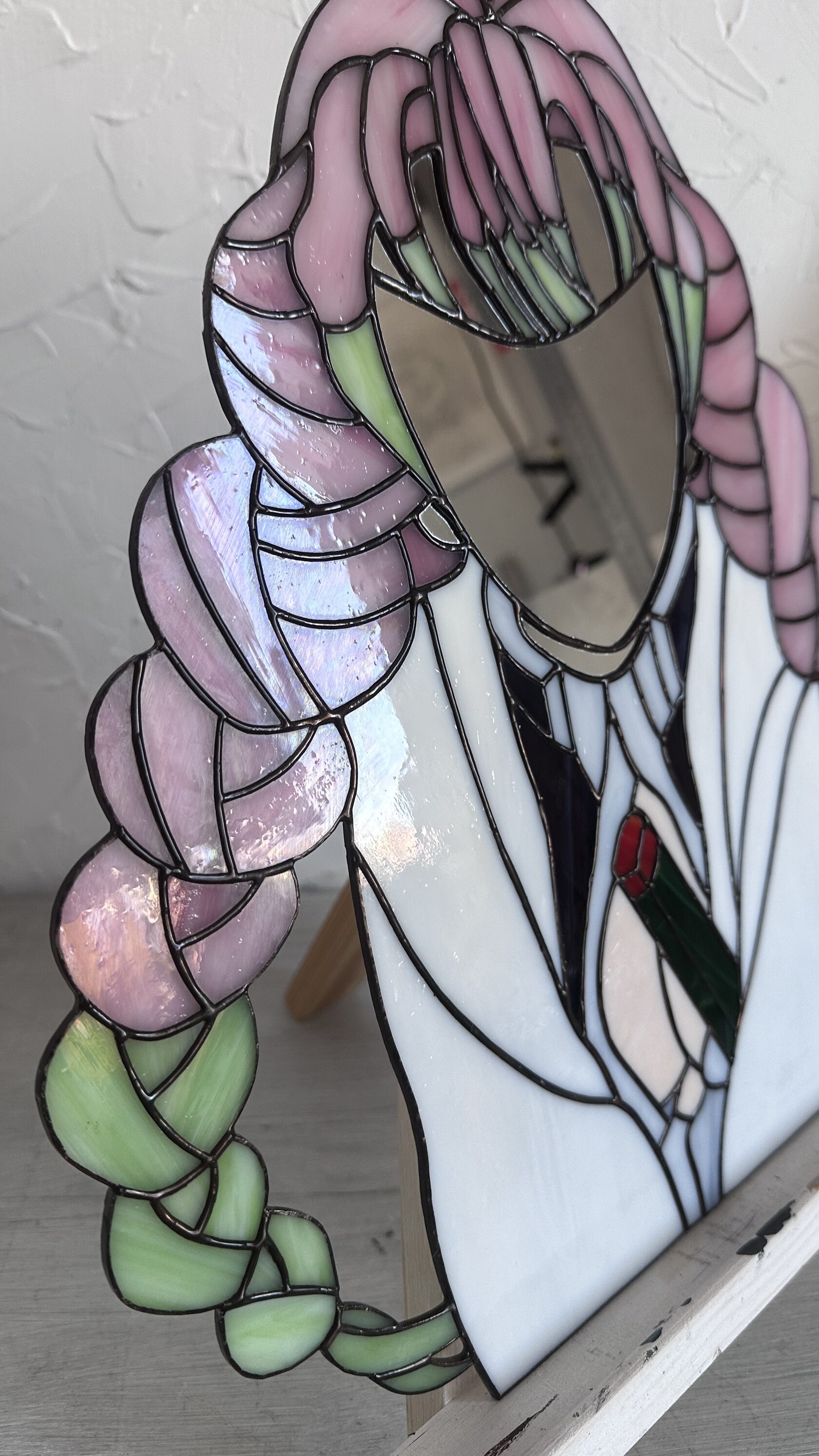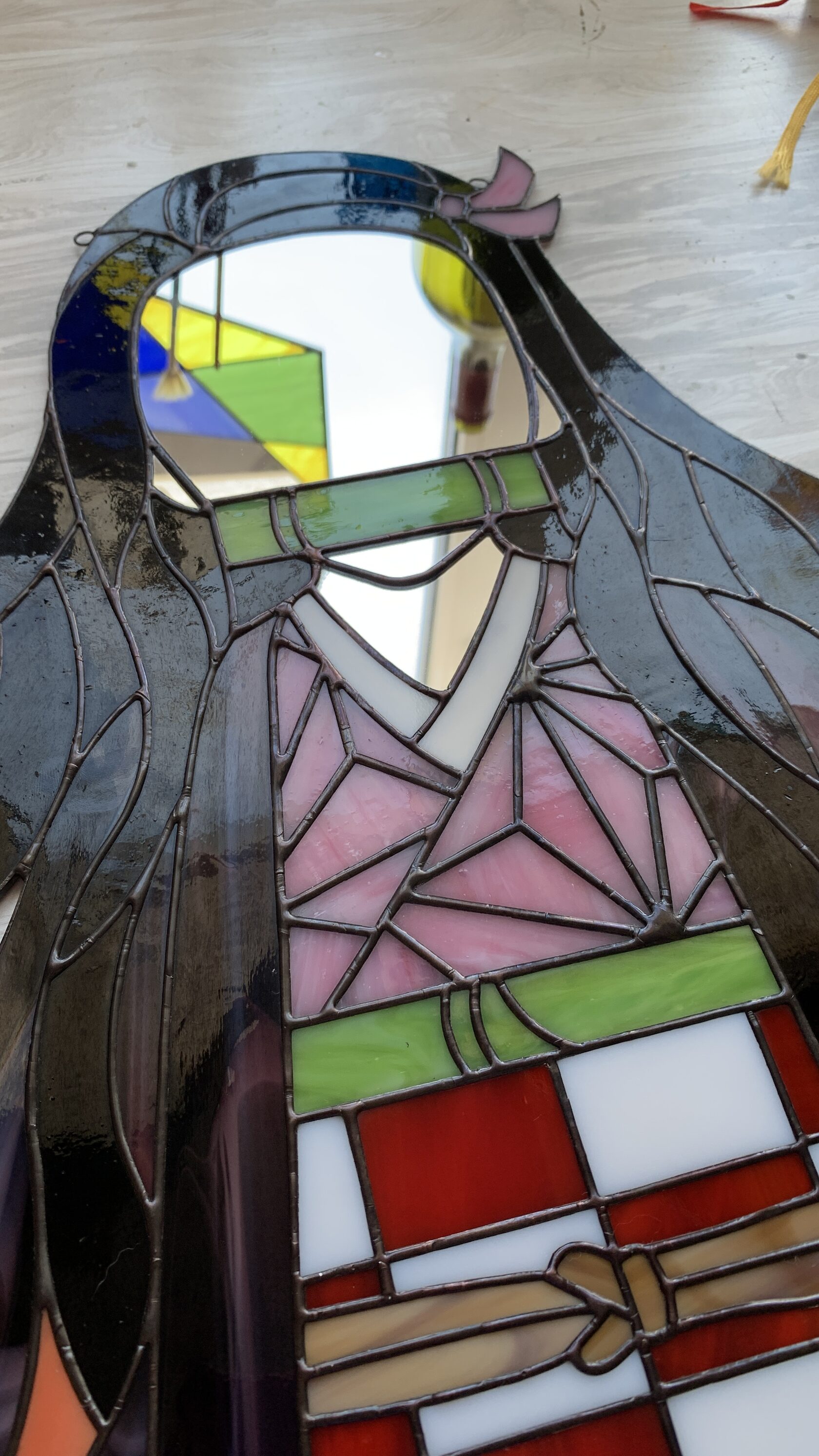 Витражное зеркало по мотивам аниме «Клинок рассекающий демонов». Полностью ручная работа. В работе использовано ирридированое стекло, которое переливается различными цветами под разным углом.