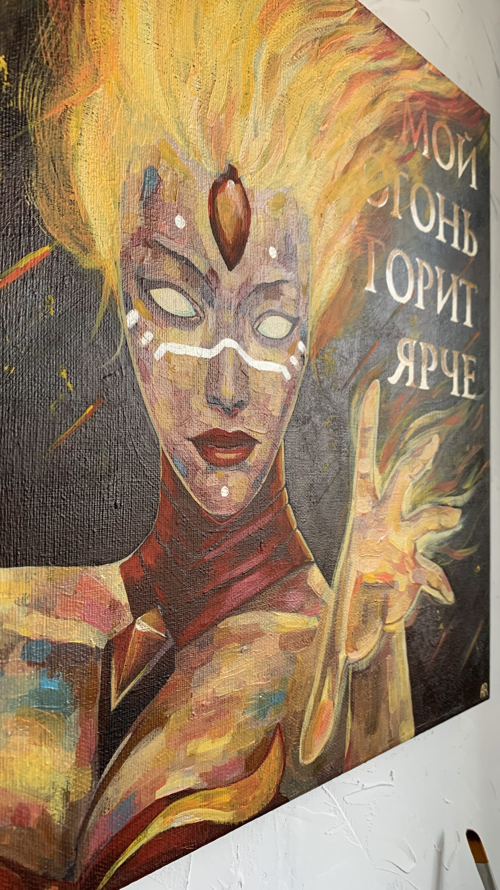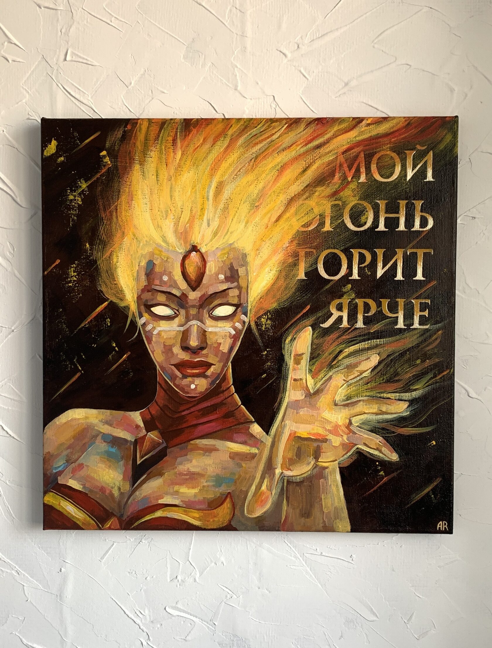 Выполнена на заказ для фаната Дота2. В работе использована светоотражающая краска, которая переливается под определенным углом. Мотивирующая надпись - цитата любимого персонажа.